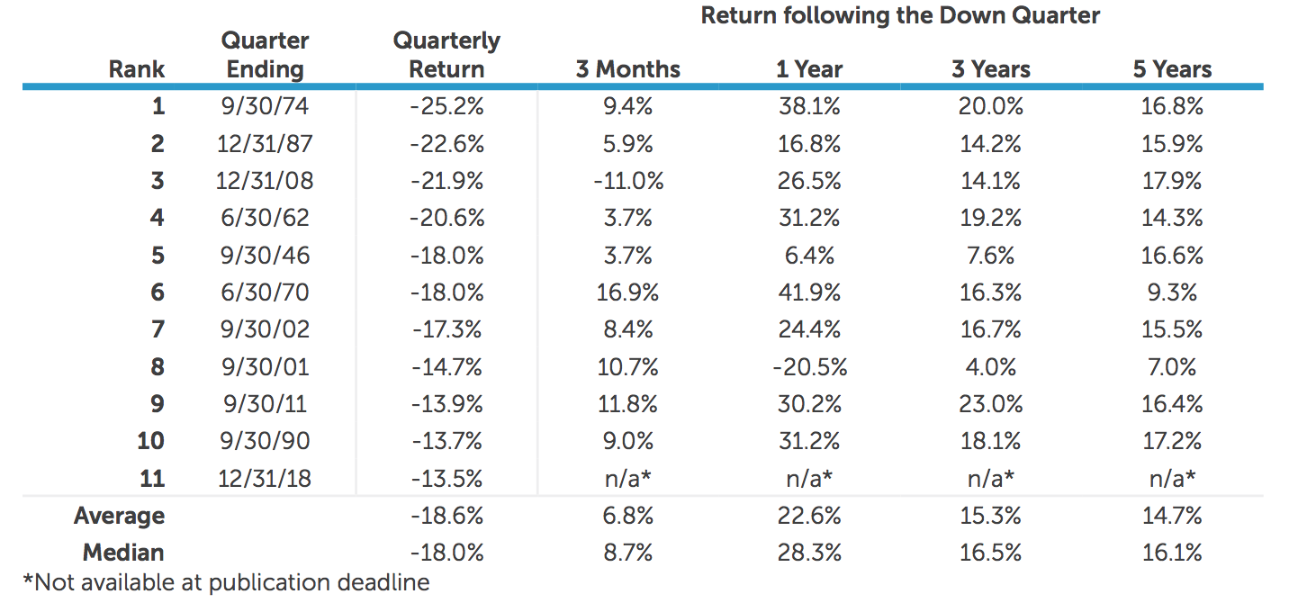 In the table we list, by order of magnitude, the largest calendar quarter declines in the U.S. stock market since the end of World War II. (The end of World War II is often used as a starting point because the Federal Reserve had its current mandate and tool kit in place by then.) Next to each return we show the subsequent market returns for the following quarter, 1-, 3- and 5-year periods. You can see that the worst quarterly decline of -25.2% occurred in the third quarter of 1974, and the Q4 2018 decline was the 11th worst since 1945.