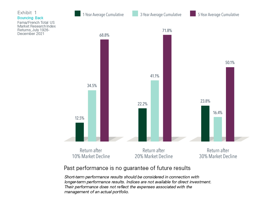 On average, just one year after a market decline of 10%, stocks rebounded 12.5%, and a year after 20% and 30% declines, the cumulative returns topped 20%. Over three years, stocks bounced back more than 30% from declines of 10% and 20%, although—while still positive—returns were not as impressive after 30% declines. But five years after market declines of 10%, 20%, and 30%, the average cumulative returns all top 50%.