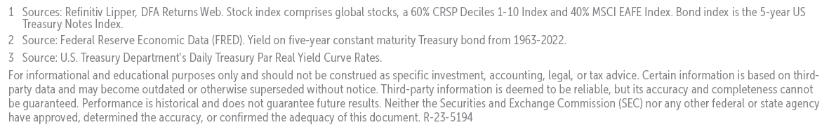 One silver lining of 2022 is that long-term expected returns for bonds have dramatically improved. As the chart shows, by the end of 2022 the yields on Treasury inflation-protected securities (TIPS) had increased from negative territory to positive. (3) This means long-term expected returns relative to inflation have also gone from negative territory to positive.