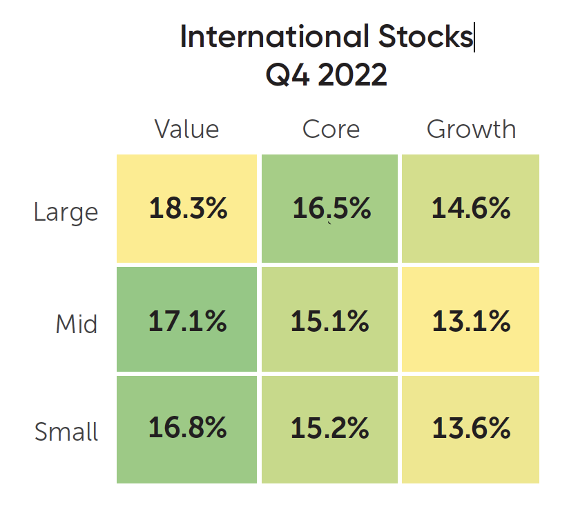 Source: Morningstar Direct, January 2023. International markets represented by respective MSCI World EX USA index series (Large: MSCI World EX USA Large, Value and Growth, Mid: MSCI World Ex USA Mid, Value, and Growth, Small: MSCI World Ex USA Small, Value, and Growth).