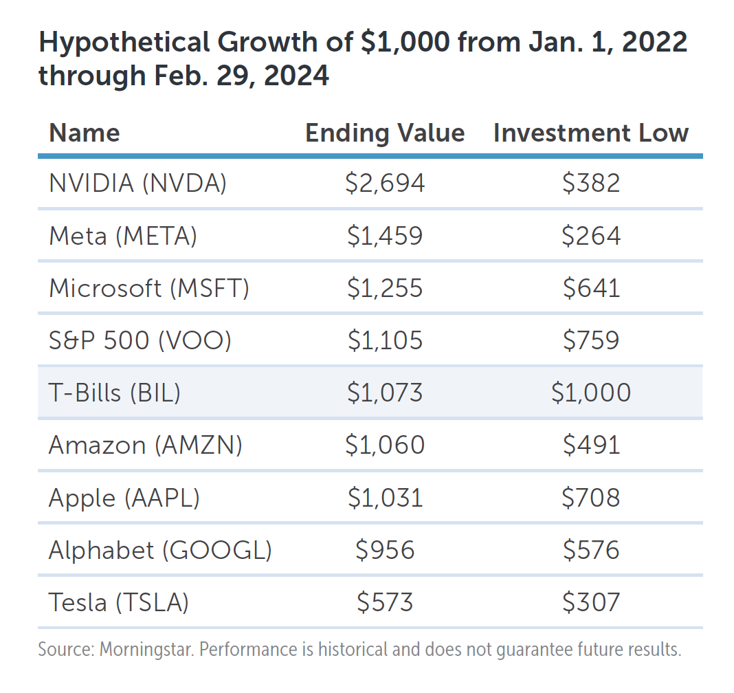 But the Magnificent Seven also benefited from another tailwind: along with the broader stock market, they were recovering from sharp price declines in 2022. On average, the Magnificent Seven stocks fell 46% in 2022 compared to just an 18% decline for the S&P 500. NVIDIA at one point lost over 60% of its value; Meta lost over 70%. In fact, over half of the Magnificent Seven companies haven’t even outperformed risk-free Treasury bills since January 2022.