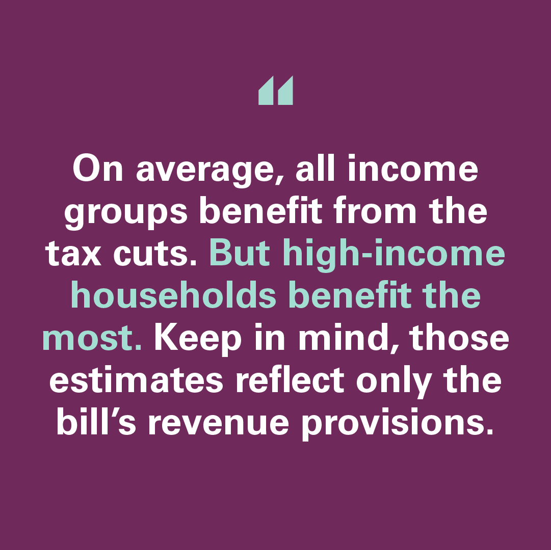 Bottom line: On average, all income groups benefit from the tax cuts. But high-income households benefit the most. Keep in mind, those estimates reflect only the bill’s revenue provisions. Low-income households end up worse off after taking into account the bill’s spending cuts, especially for Medicaid, SNAP (food stamps), and Affordable Care Act health insurance subsidies.