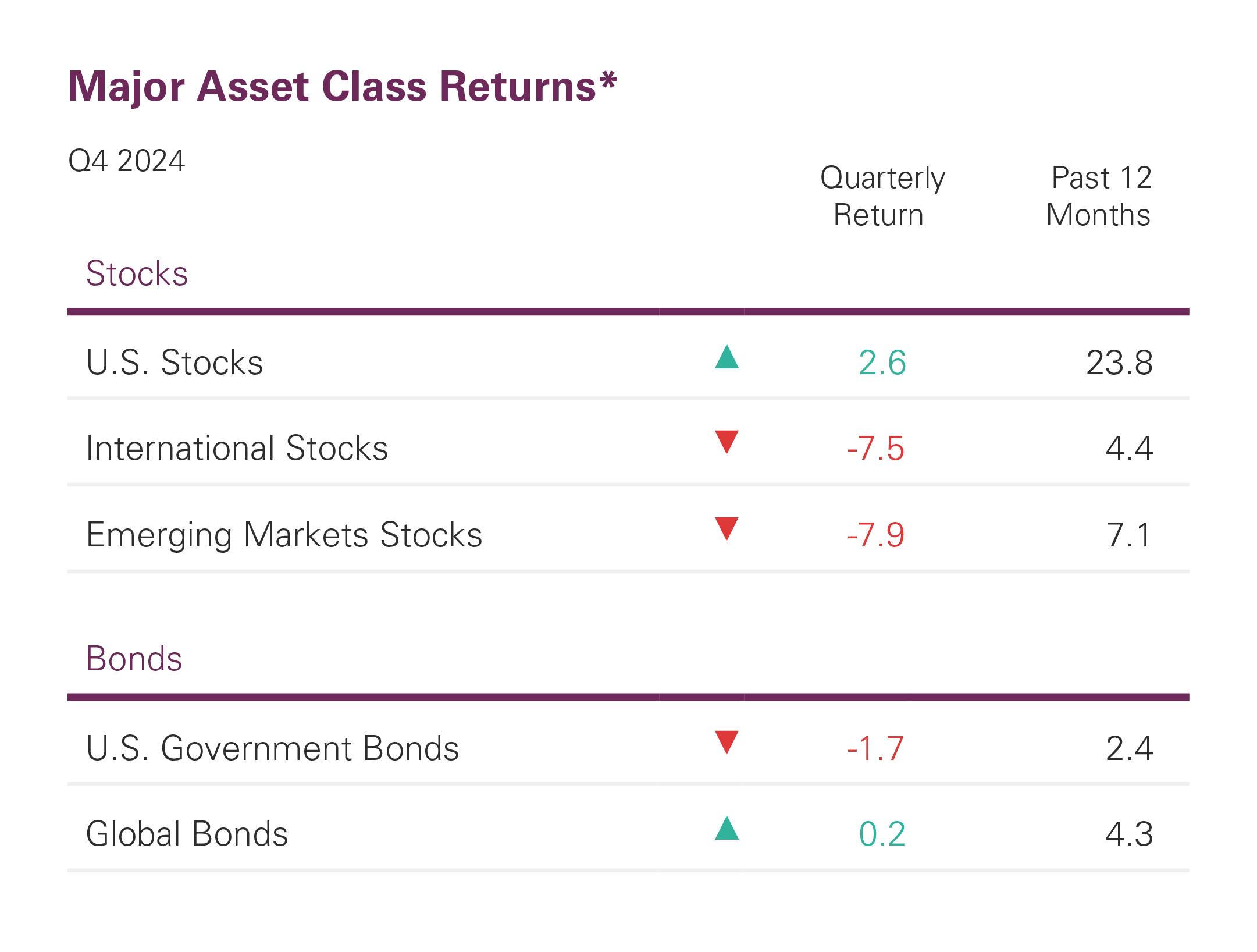 Fixed income returns in the U.S. were negative in the fourth quarter as rates rose sharply over the quarter. The increase in rates was driven by expectations that the Fed would have to slow the pace of rate cuts in 2025 to combat sticky inflation.