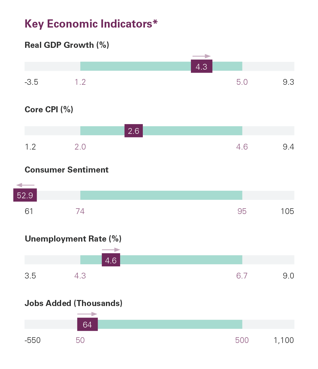 The U.S. economy showed renewed strength in Q3, expanding at a robust 4.3% annualized pace (1), exceeding expectations, supported by solid consumer spending despite weak confidence. Inflation showed signs of moderation, with November CPI cooling to 2.7% (2) from 3.0% the prior month. However, labor market conditions remain a concern, as job growth slowed and the unemployment rate rose to 4.6% (3), the highest level in four years.